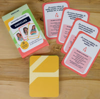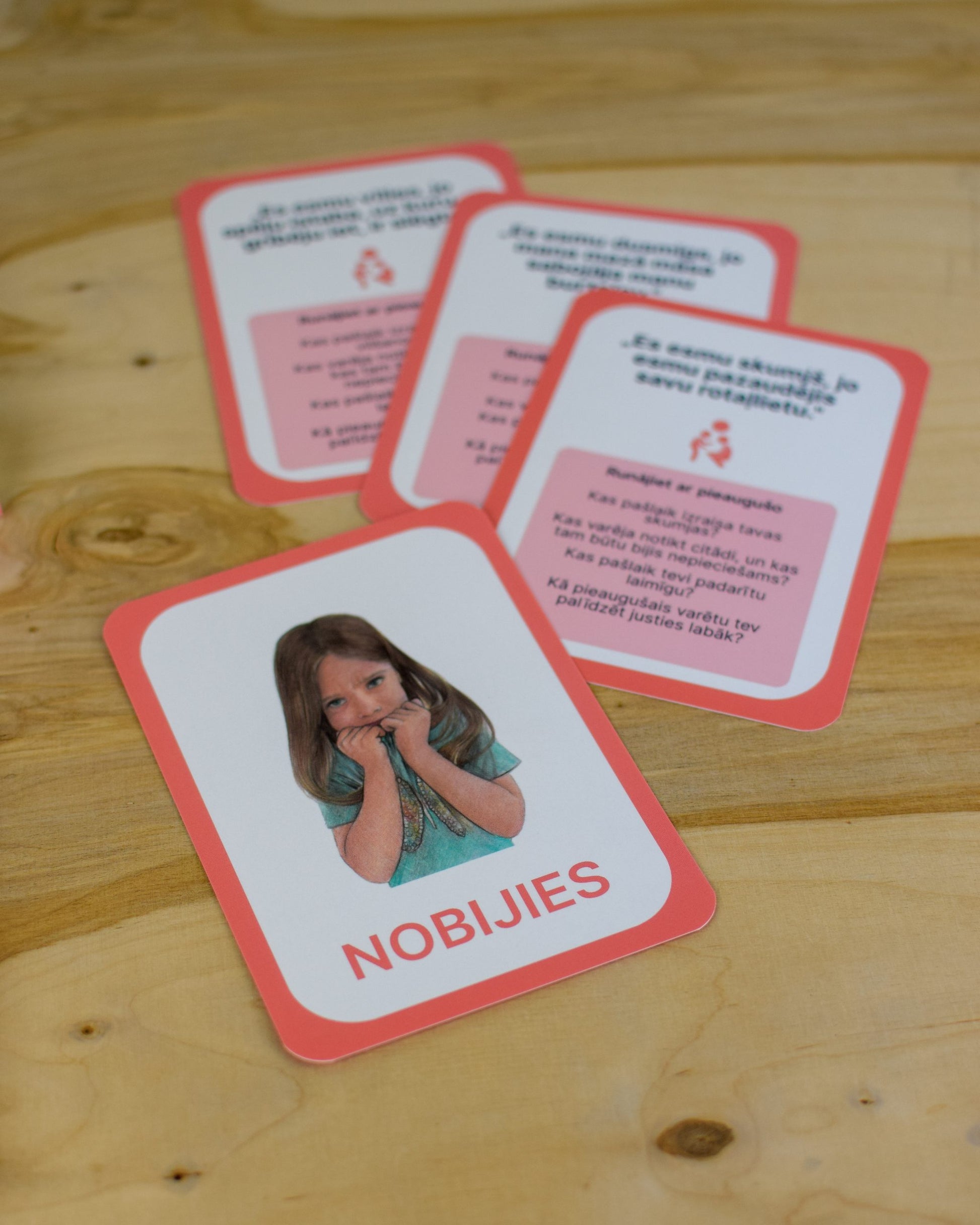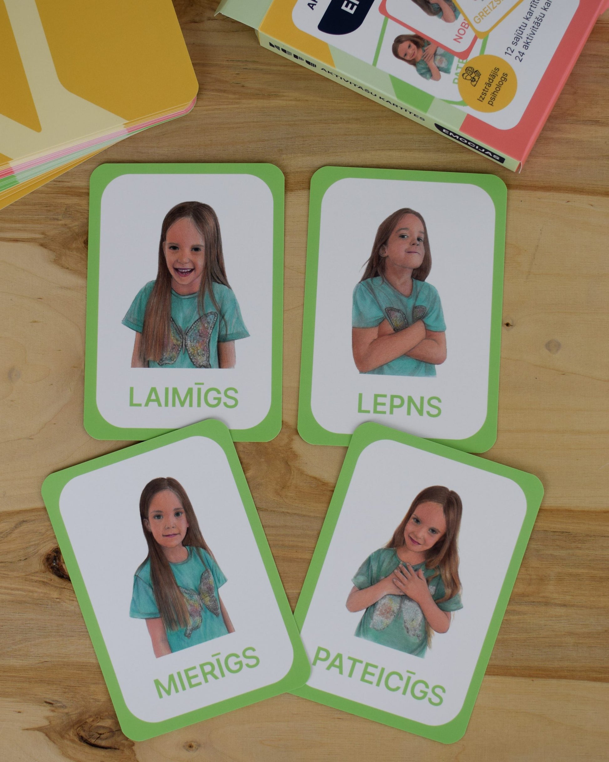 Emociju kartīšu priekšpusē ir emocijas nosaukums un ilustratīvs attēls. Aizmugurē ir situācijas piemērs, kas var izraisīt šādu emociju, un noderīgi jautājumi emocijas izpratnei.
