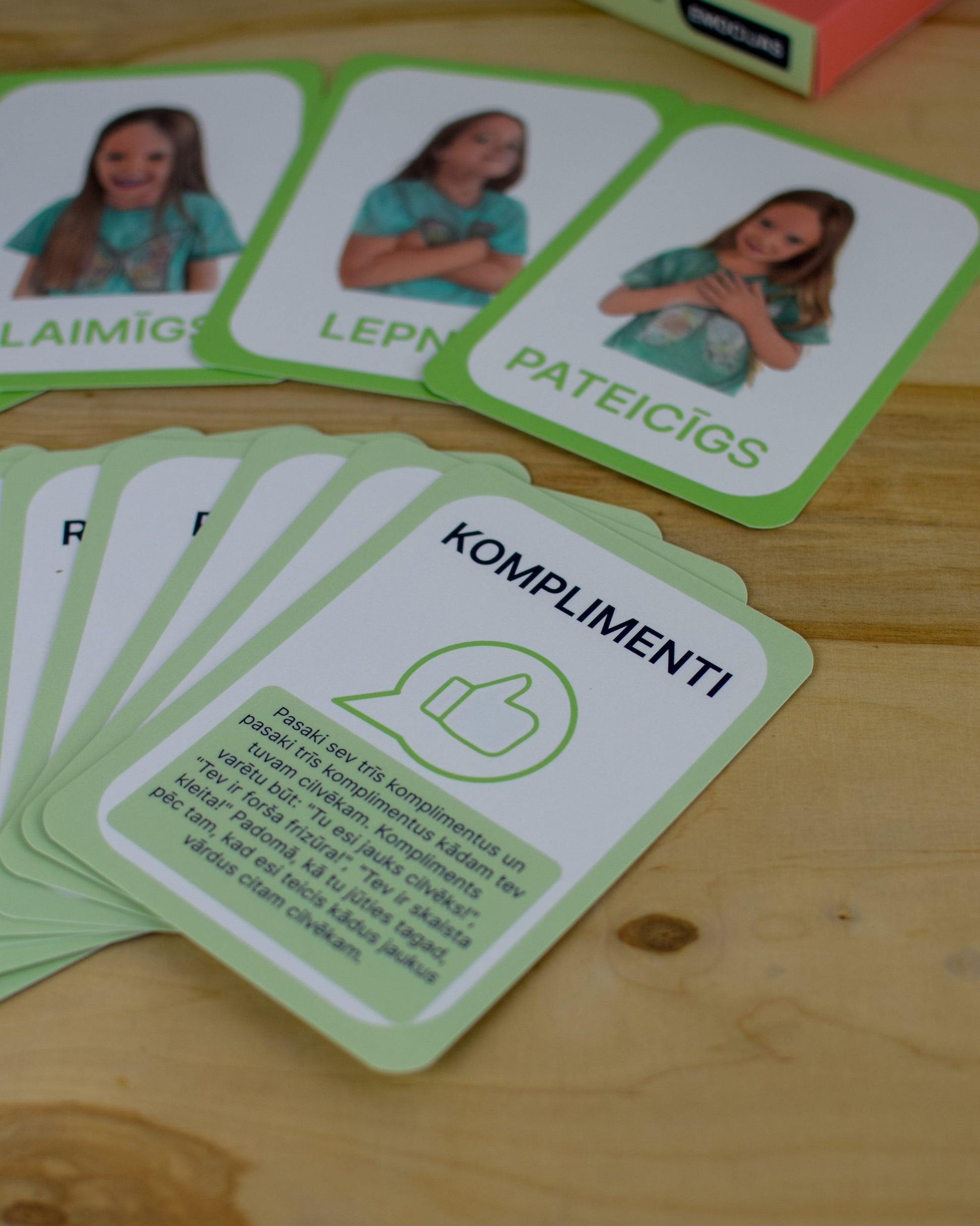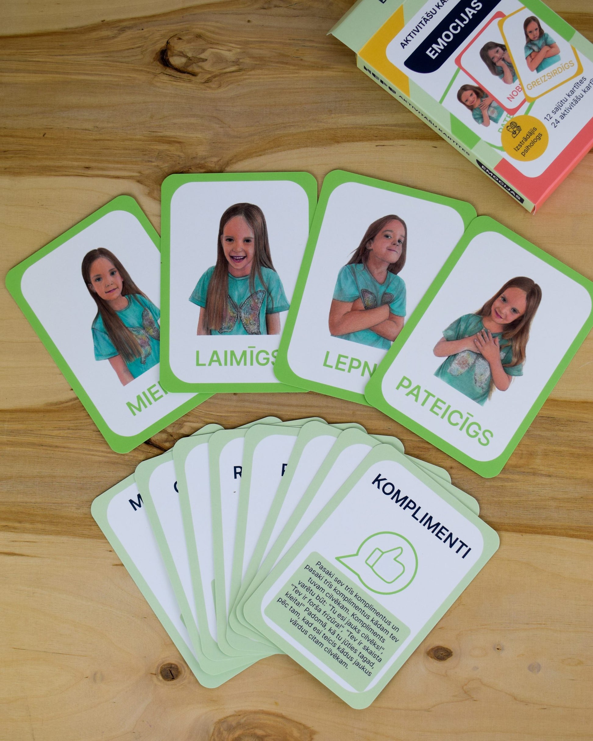 Aktivitāšu kartītes palīdz tikt galā ar emocijām. Katrā kartītē ir aktivitātes nosaukums, ilustratīvs zīmējums un instrukcijas.