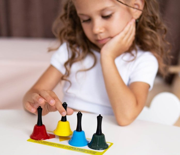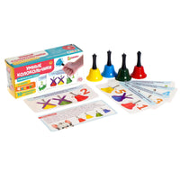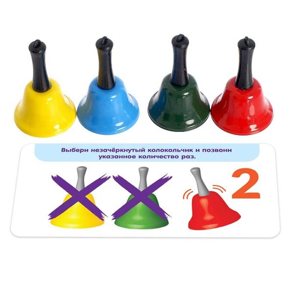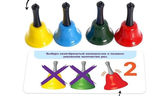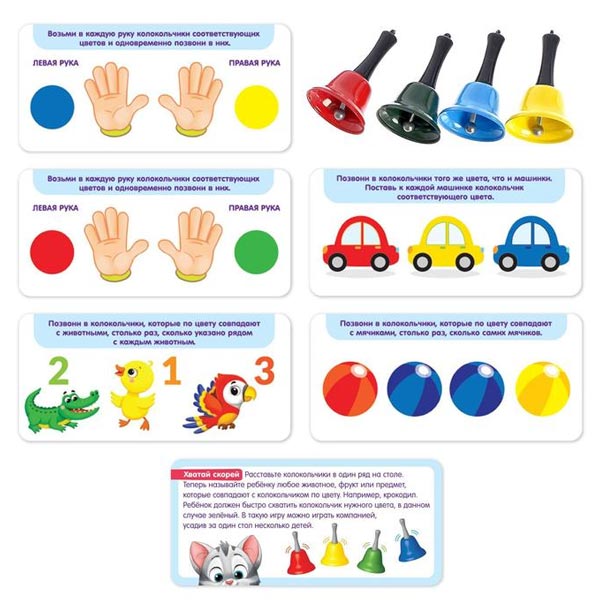 Komplektā ir 4 zvaniņi (5.5 x 3.5 cm) un kartītes ar 10 uzdevumiem.
