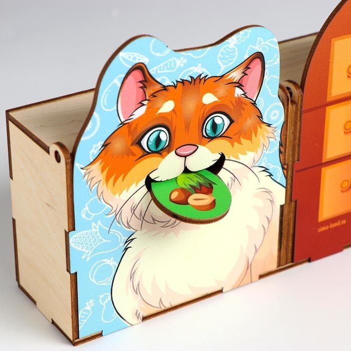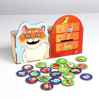 Škiet, ka kaķītis ir izsalcis! Lai pabarotu kaķīti, bērnam jāsaliek kastē ar kaķi tikai tos žetonus, uz kuriem ir attēlots ēdiens.