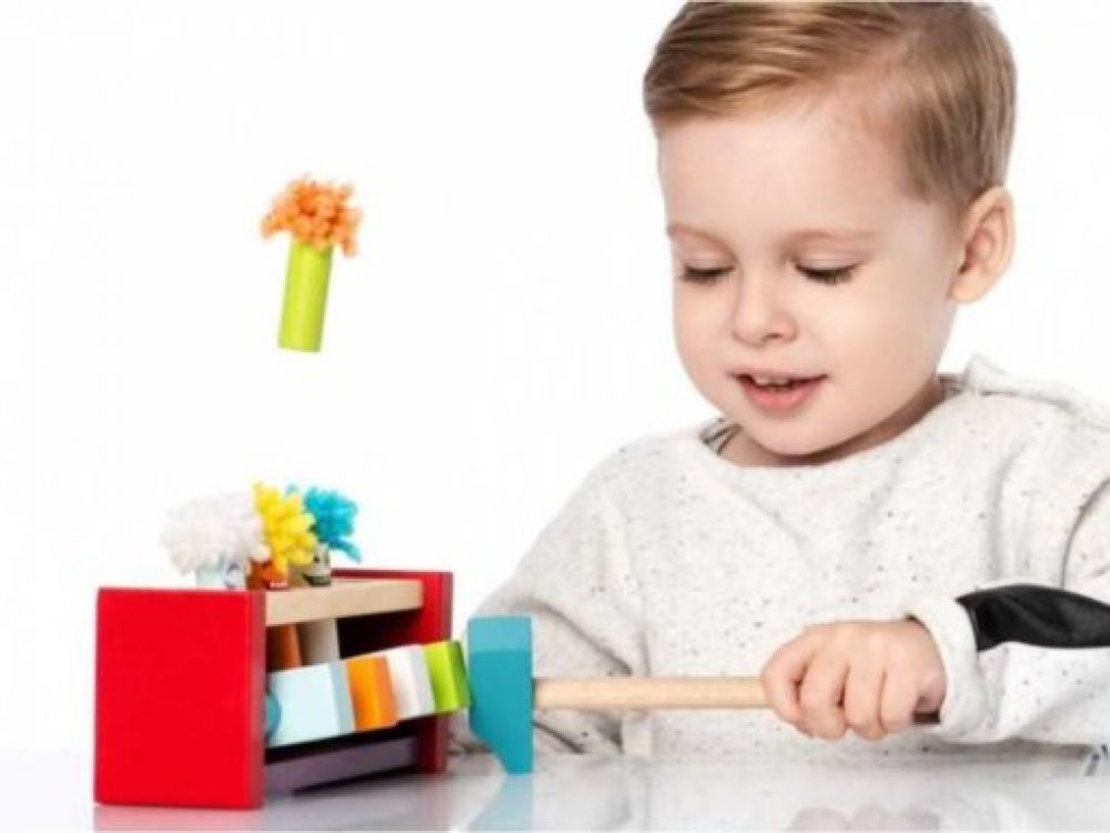 Komplektā ir koka āmuriņš, koka pamatne ar caurumiem priekš koka klauniem un 4 krāsaini jautri klauni. Izmantojot āmuriņu, jāuzsit pedālim, kur stāv klauns, tādā veidā, lai klauns "izlektu" no savas vietas. Šī spēle noteikti liks bērnam smieties!