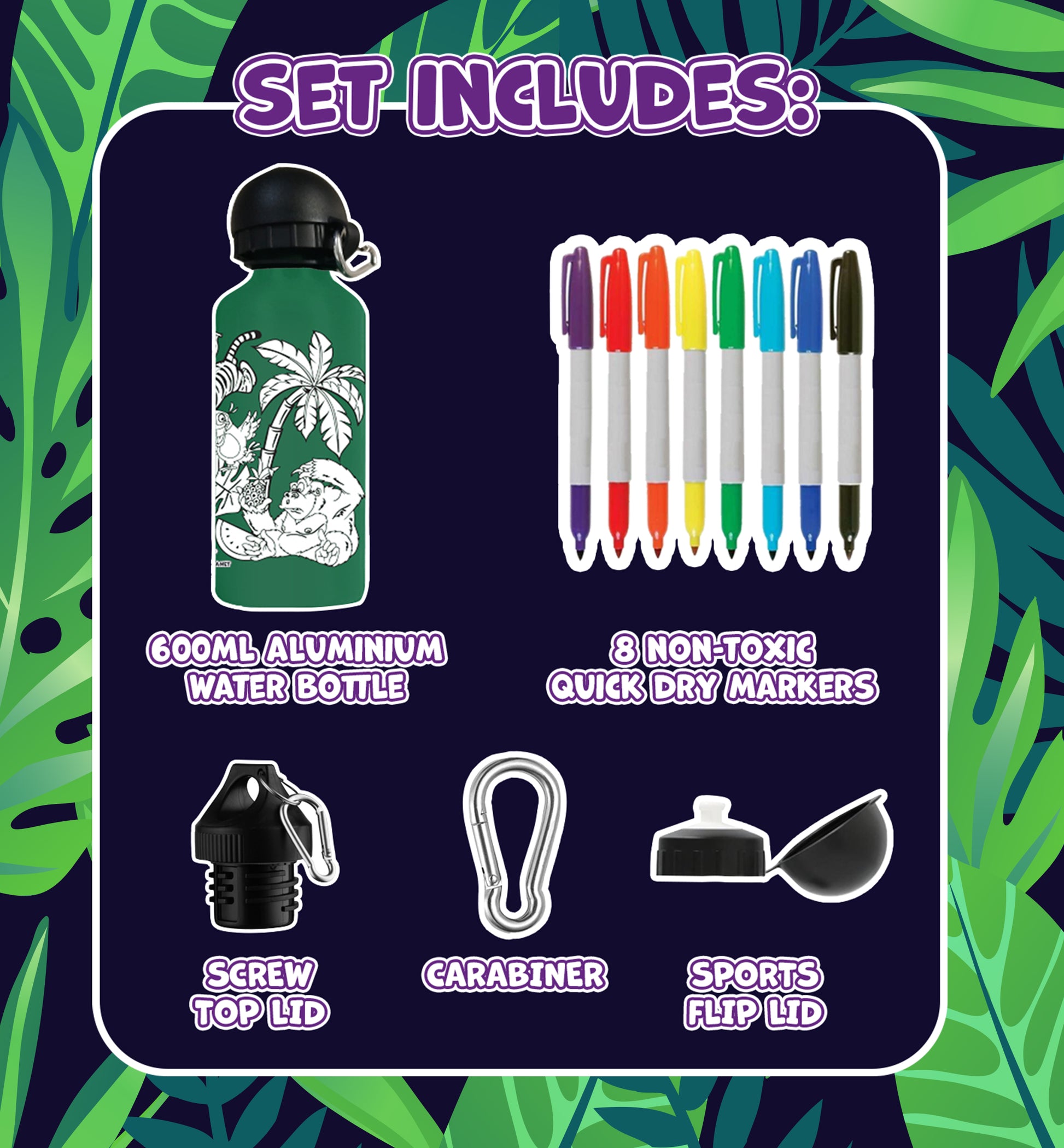 Pudeles tilpums: 600 ml. Divi vāciņu veidi. Astoņi ātri žūstoši marķieri.