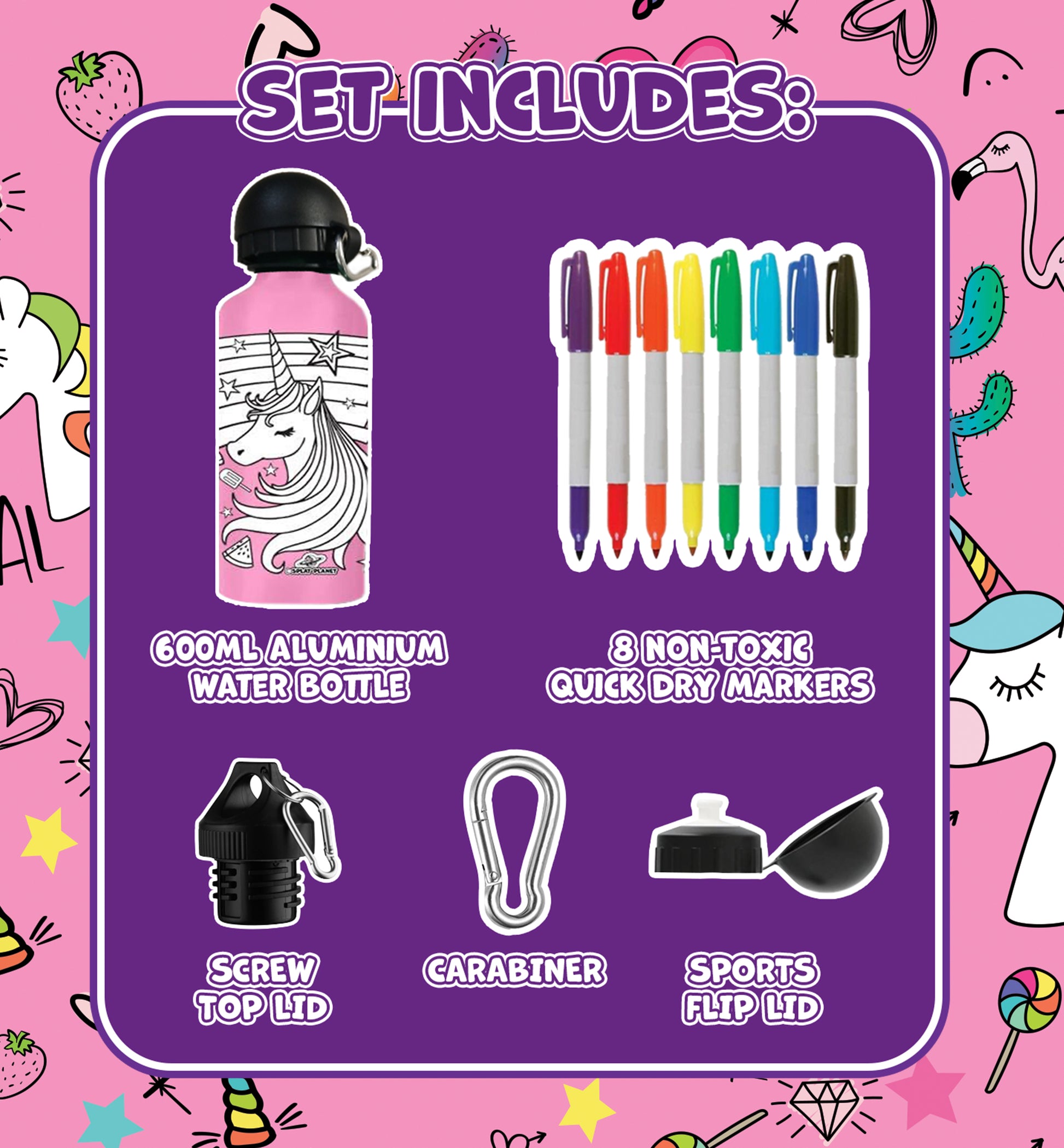 Pudeles tilpums: 600 ml. Divi vāciņu veidi. Astoņi ātri žūstoši marķieri.