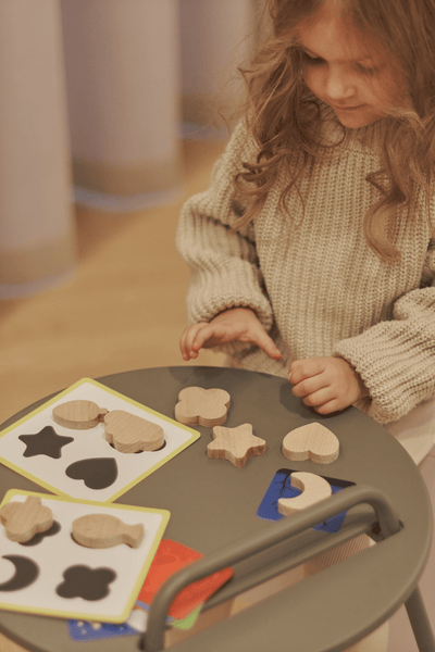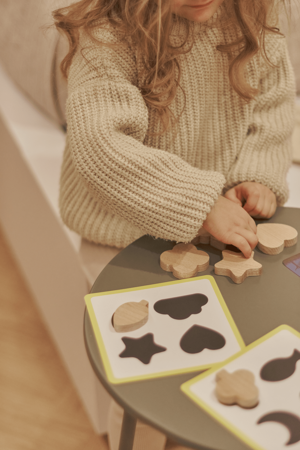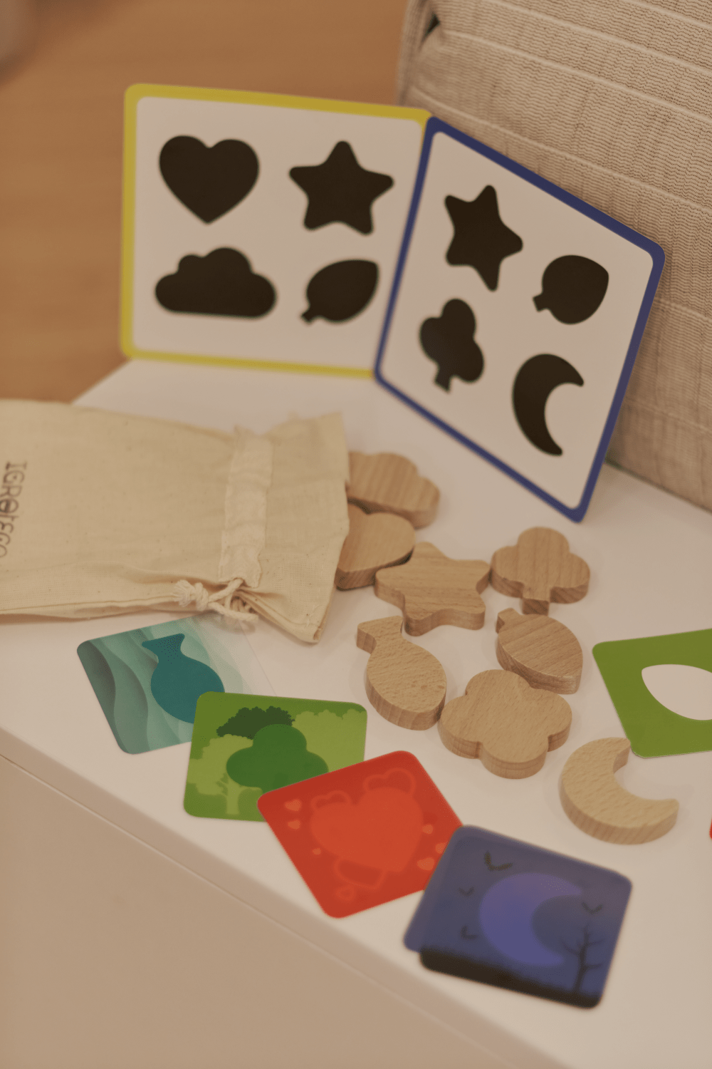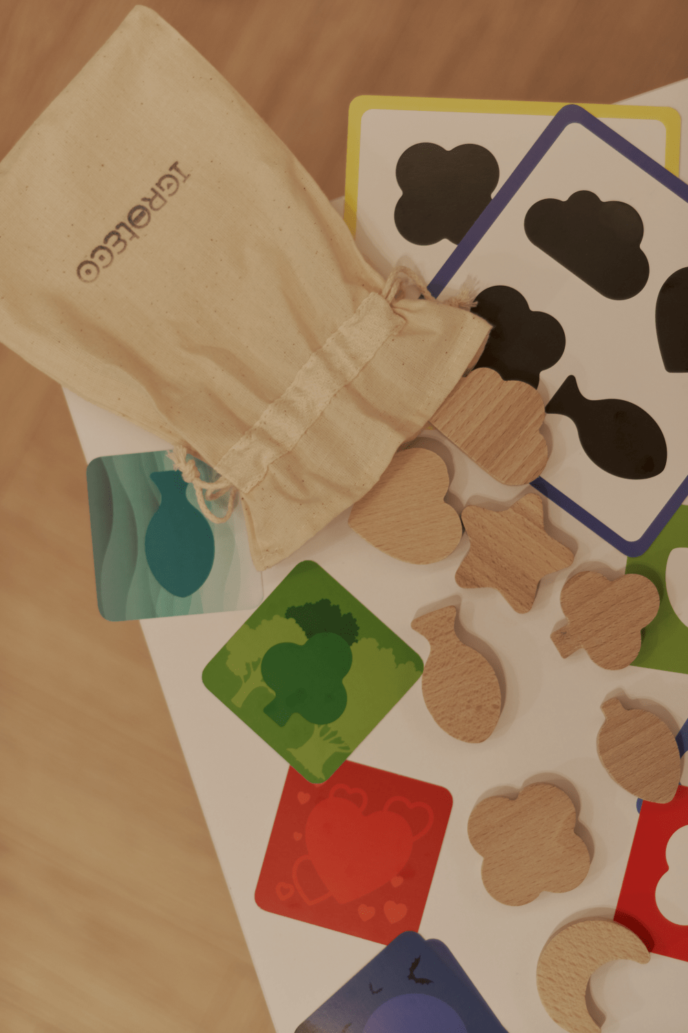 Komplektā: 8 koka figūriņas, 2 divpusējās loto kartītes, 8 kartītes ar formām-siluētiem, auduma maisiņš.