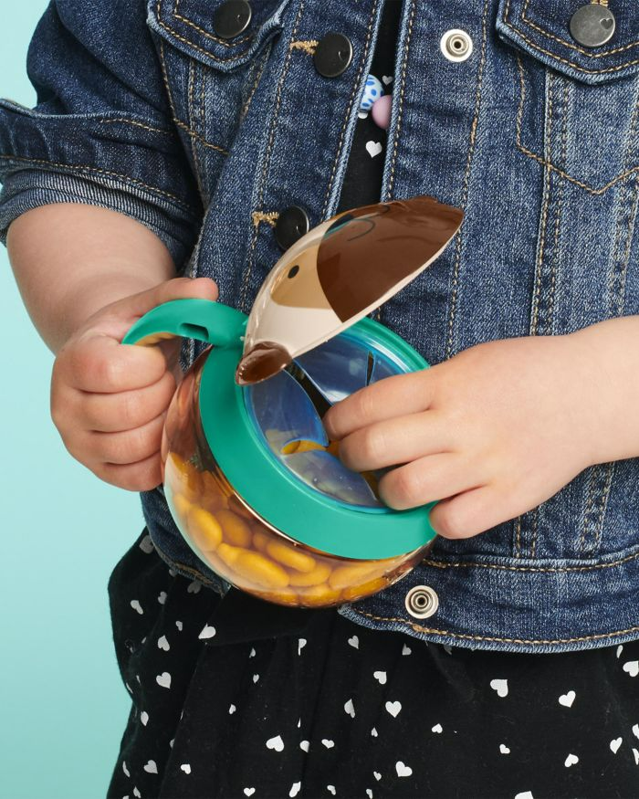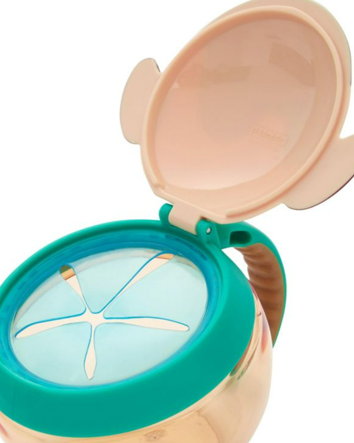 Elastīgā iekšējā atvere neļauj uzkodām izkrist, pat tad, ja trauks ir apgāzts otrādi. Viegli satverams un neslīdošs rokturis.