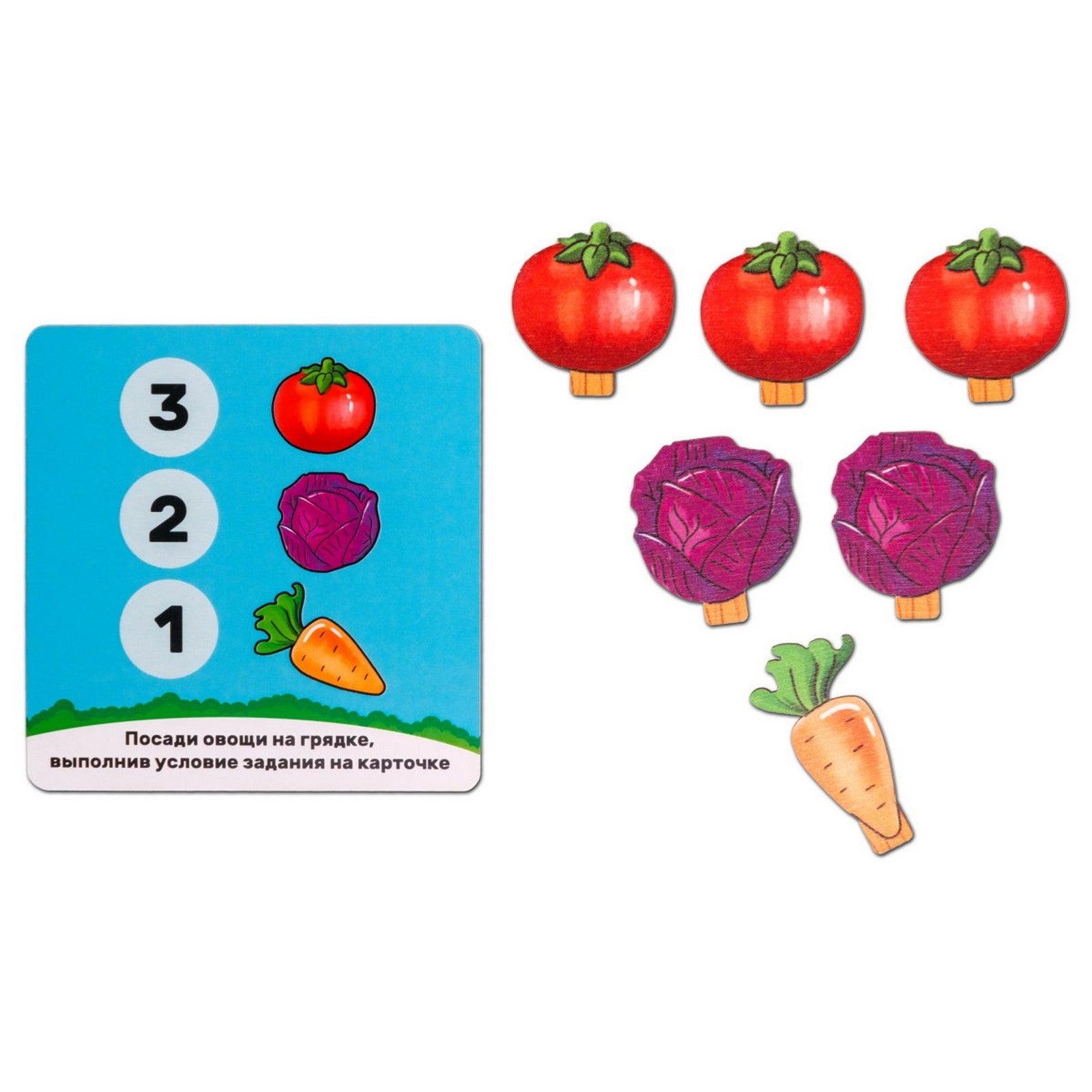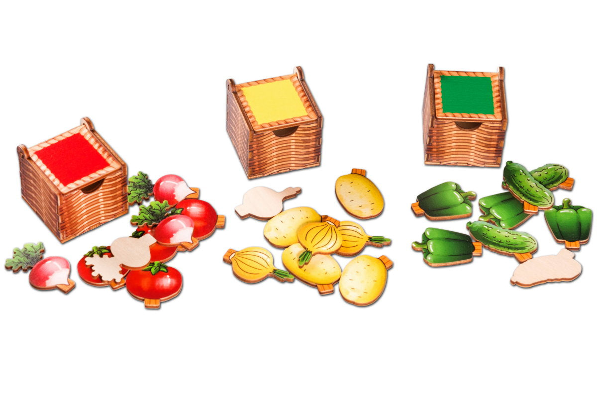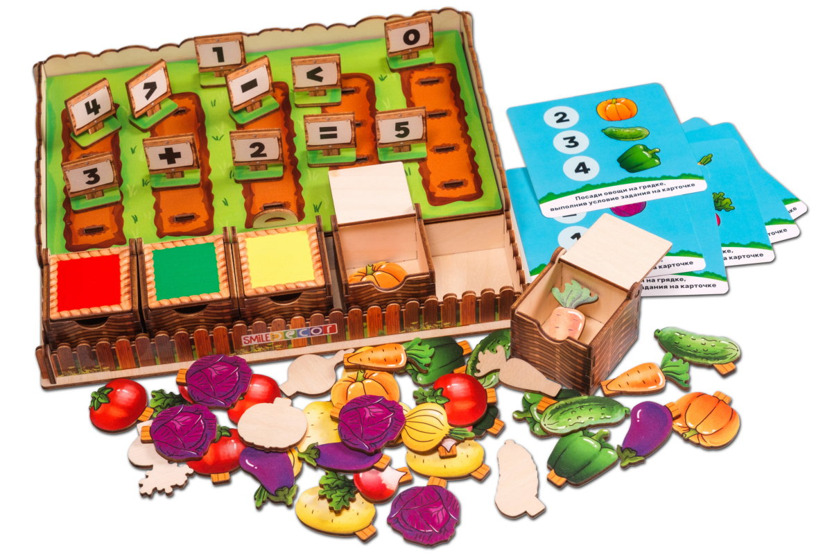 Komplektā: 5 kastes-grozi, 40 dārzeņu figūras, 11 figūras ar cipariem un zīmēm, 6 divpusējās kartītes ar uzdevumiem,