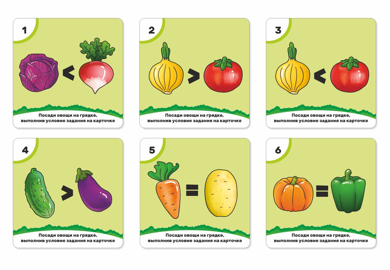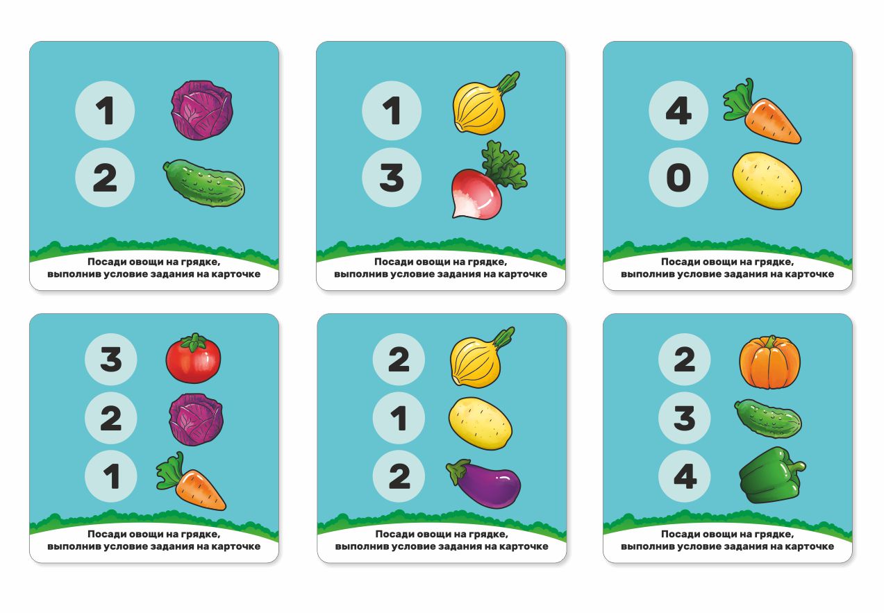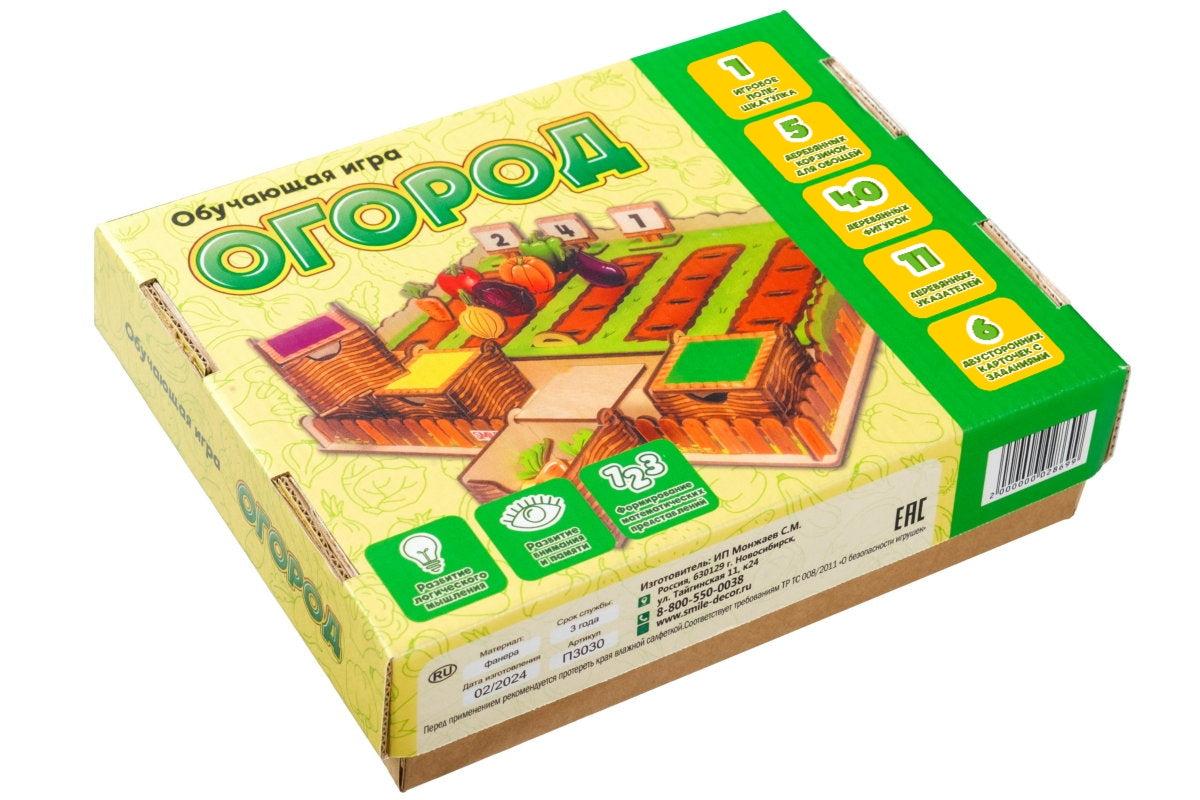 Komplektā: 5 kastes-grozi, 40 dārzeņu figūras, 11 figūras ar cipariem un zīmēm, 6 divpusējās kartītes ar uzdevumiem,