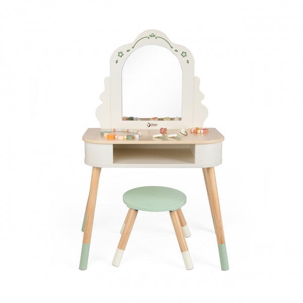 Komplektā: galdiņš ar spoguli, krēsls, aksesuāri.