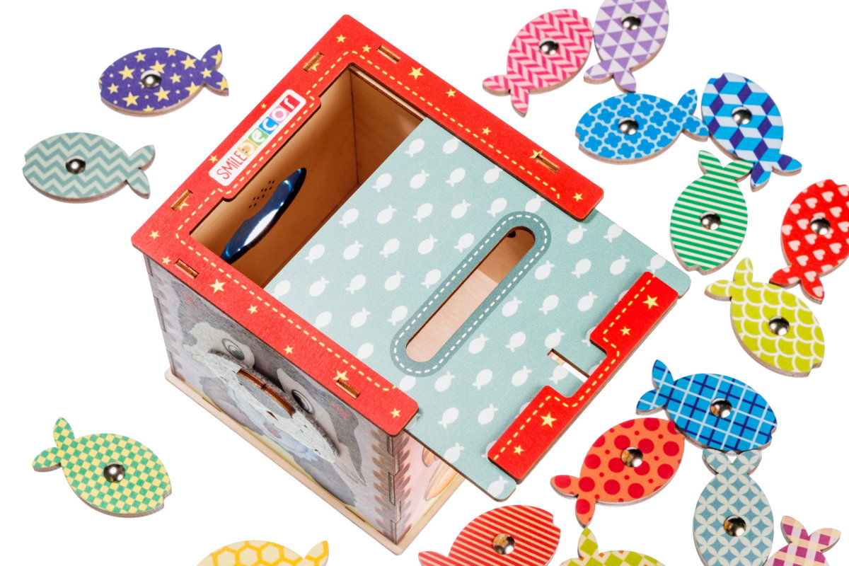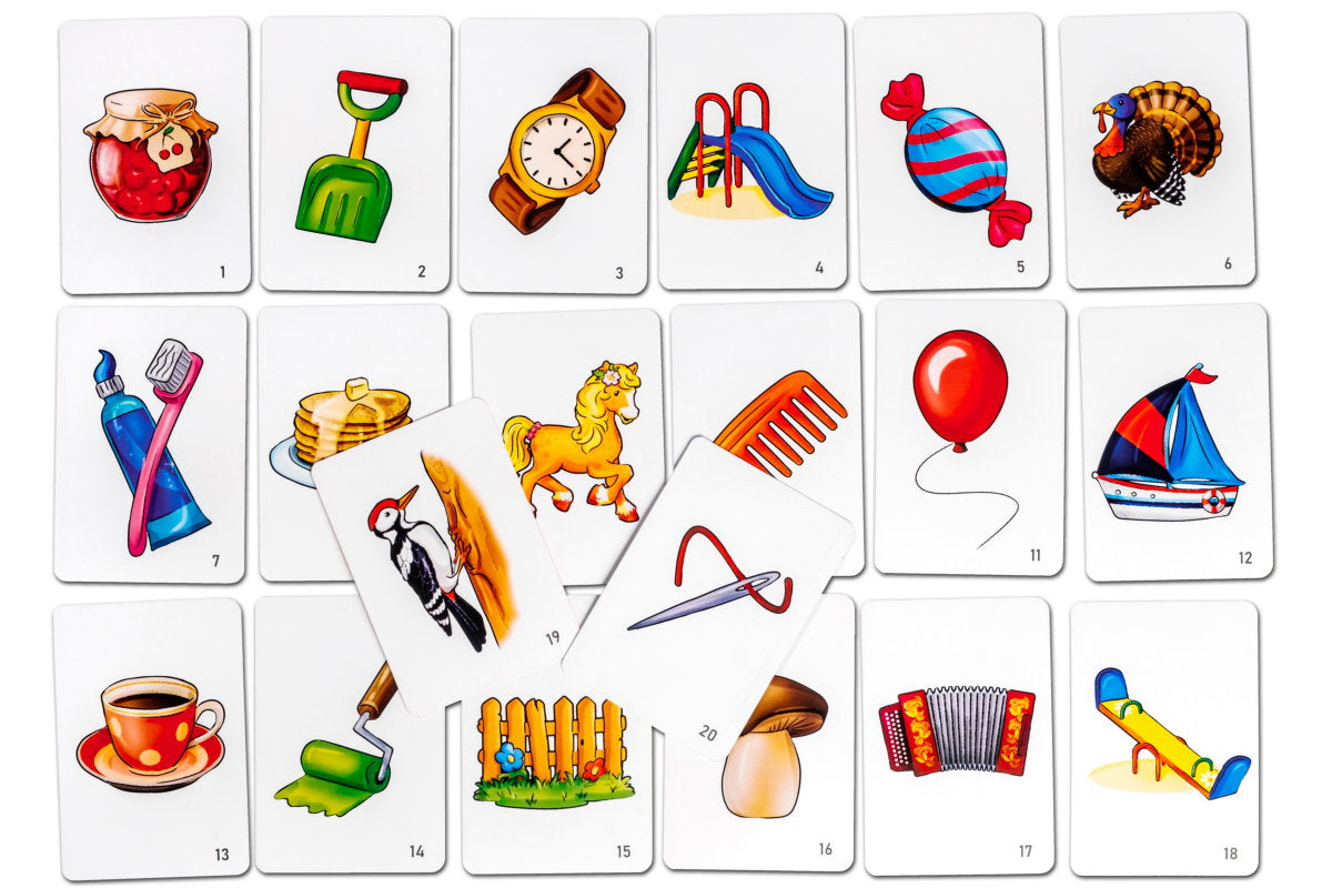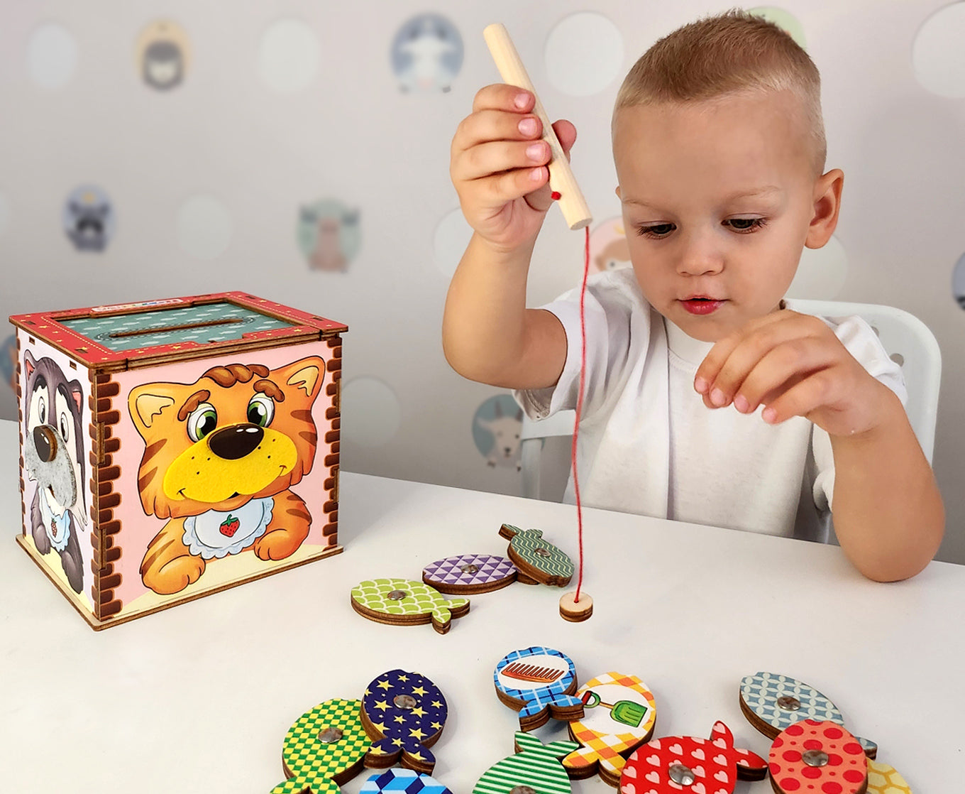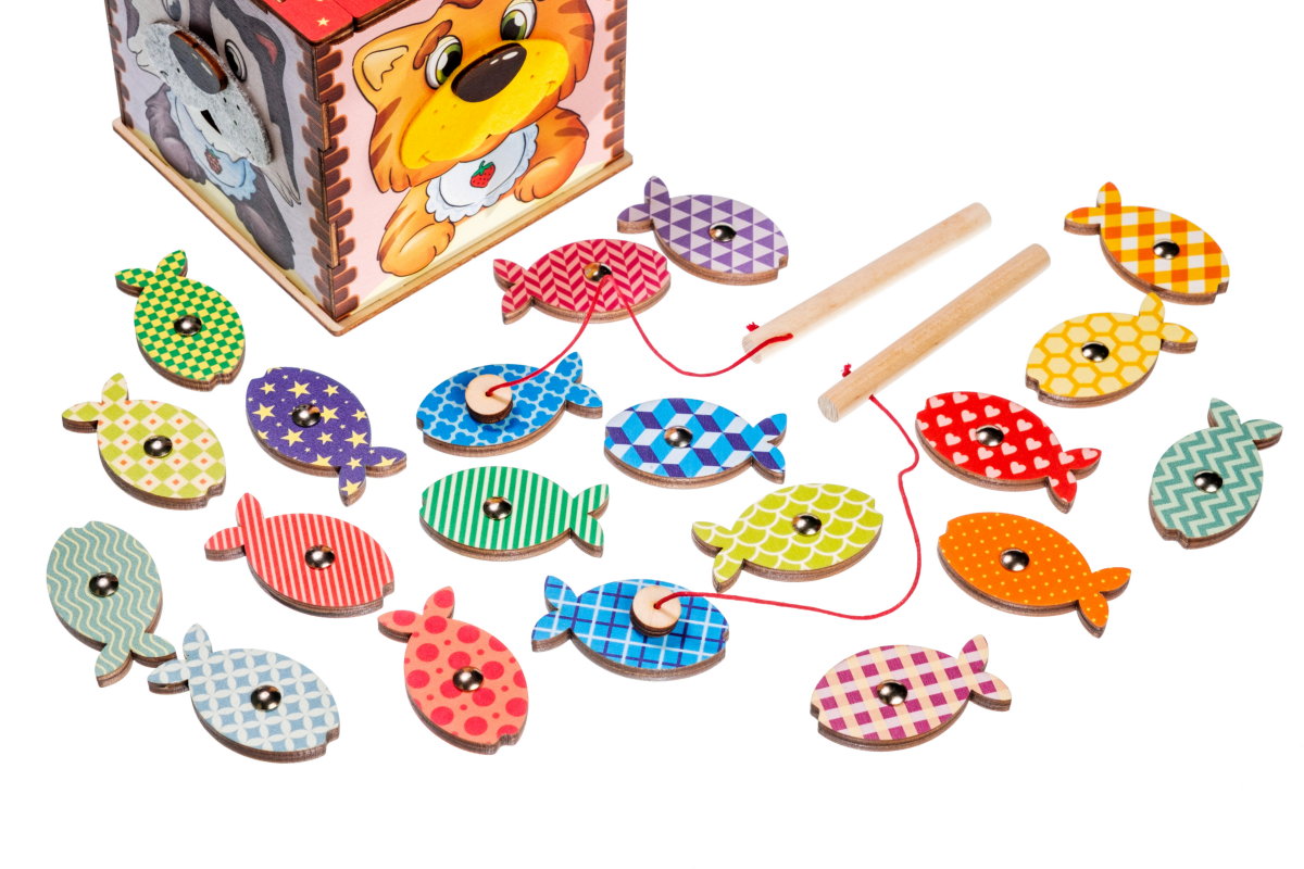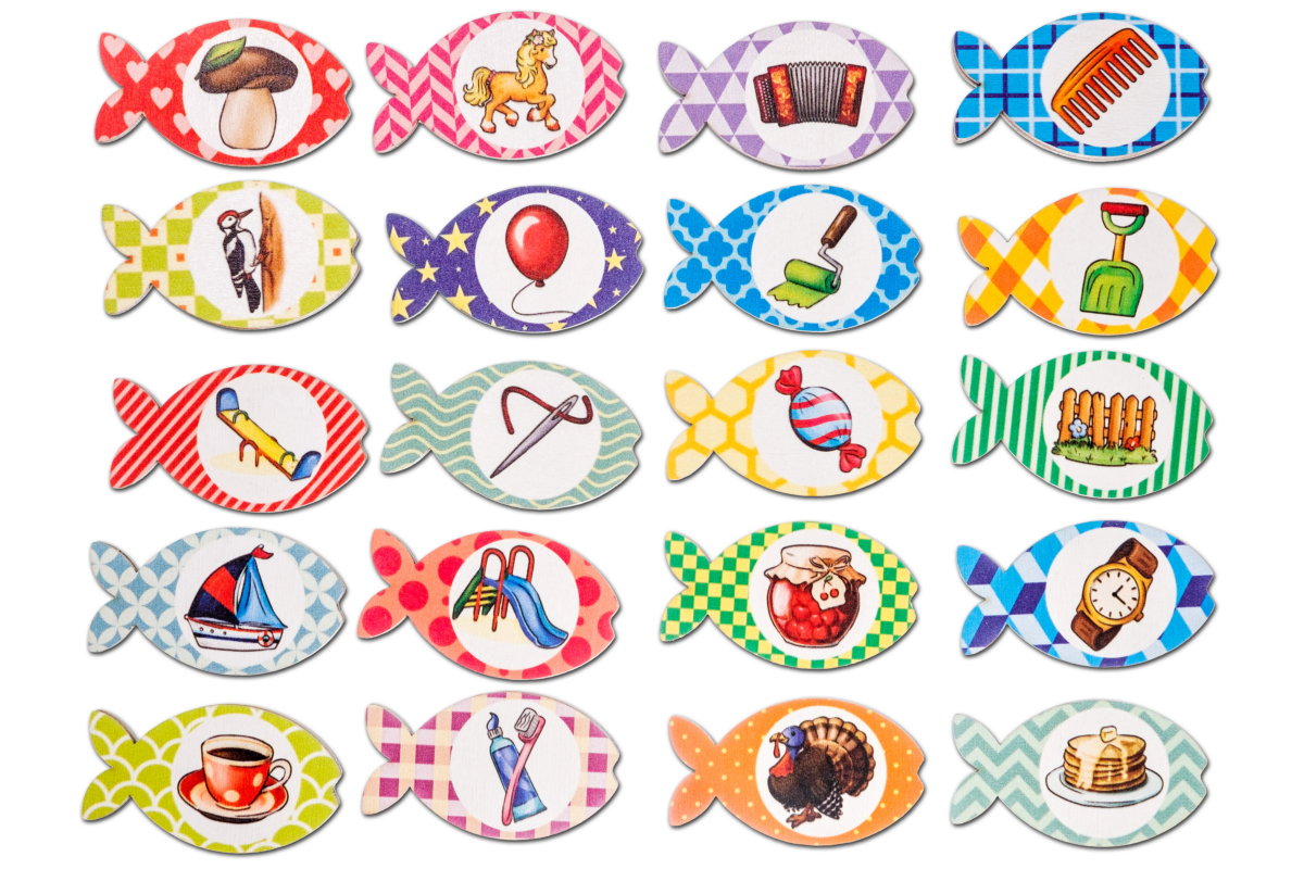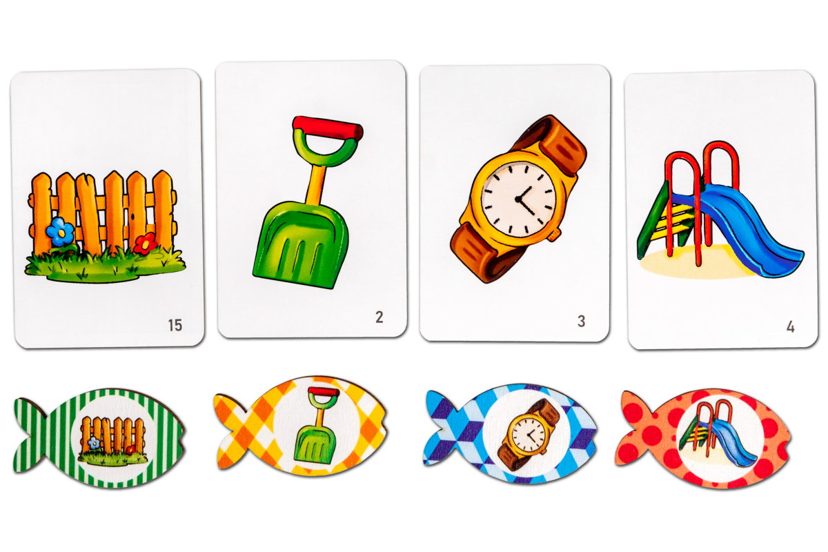 Komplektā: 20 divpusējās laminētās kartītes, 20 koka zivtiņas, 2 makšķeres, instrukcija.
