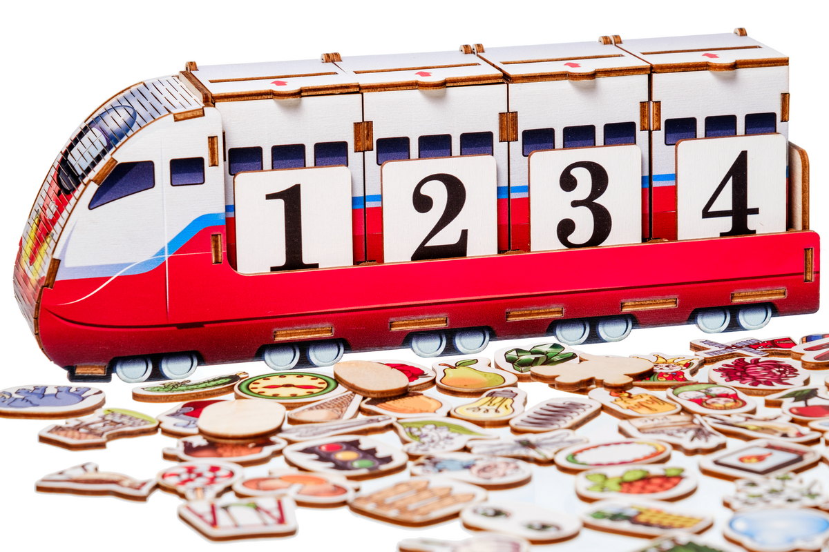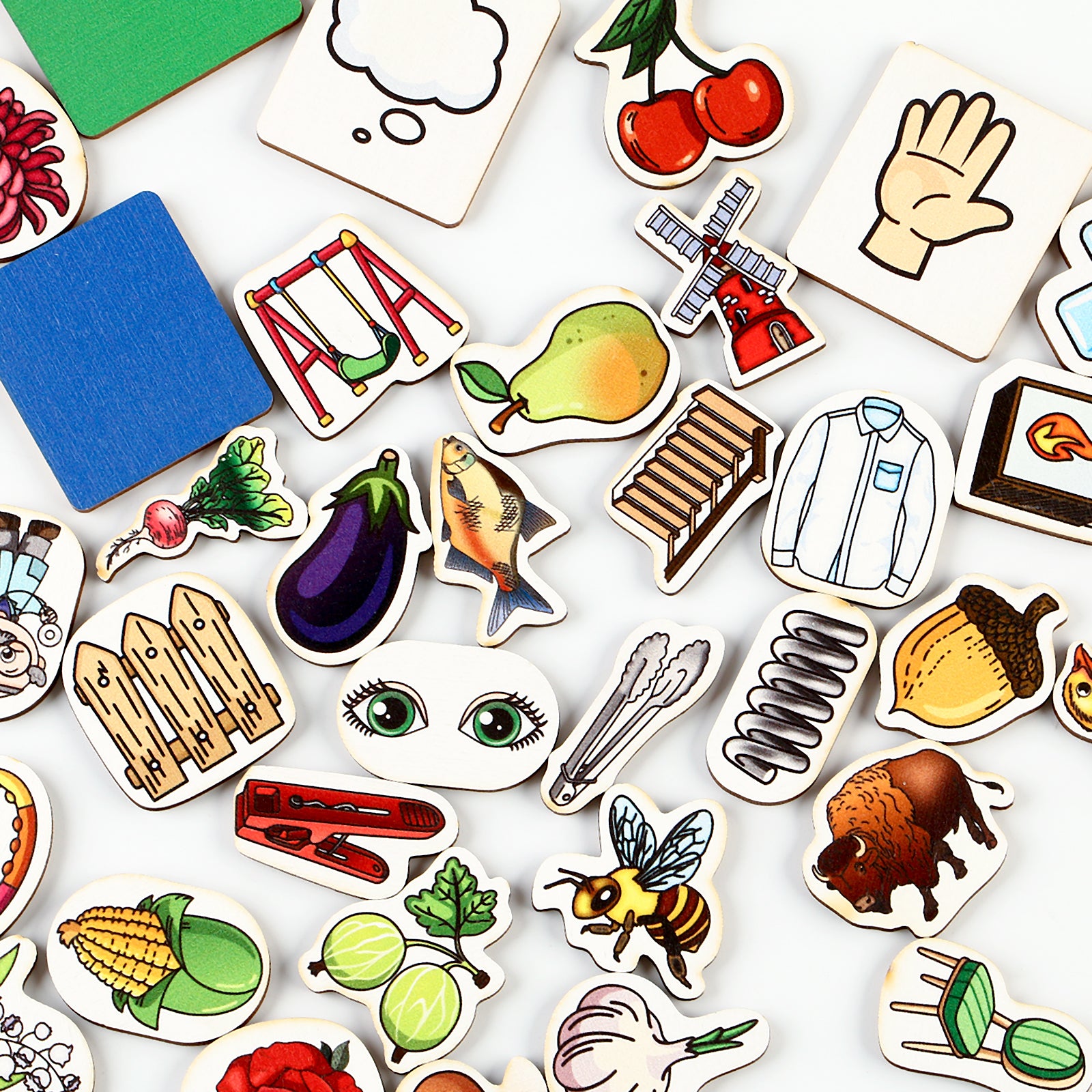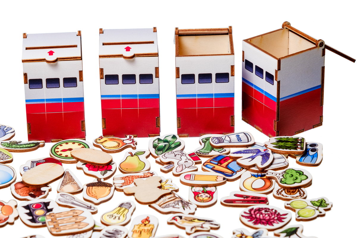 Komplektā: 70 koka figūras, 31 koka kartīte spēlēm un uzdevumiem, instrukcija.