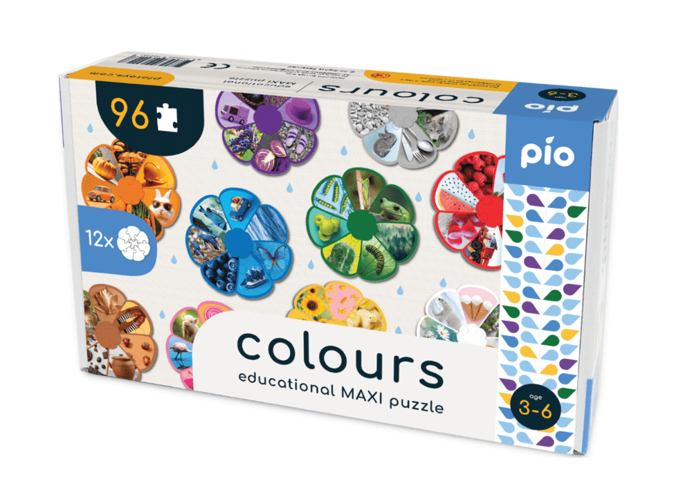 Komplektā ir 96 lielās puzles detaļas, kas veido 12 dažādu krāsu ziedus.