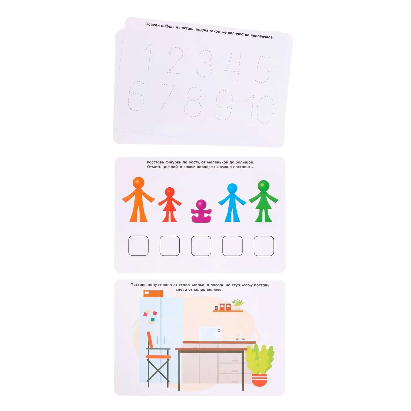 - 10 divpusējās kartiņas ar uzdevumiem (21 x 14 cm; uzdevumus var pildīt vairākkārt, izmantojot raksti/dzēs marķieri)