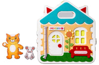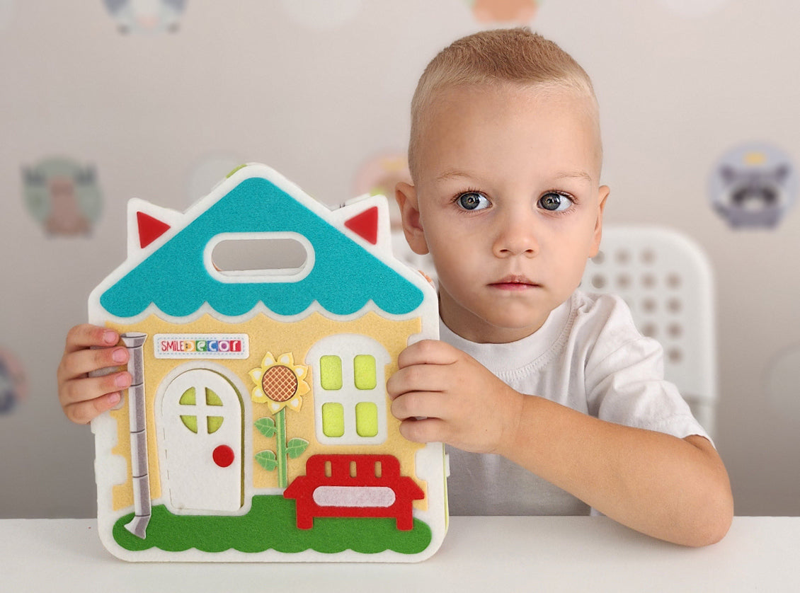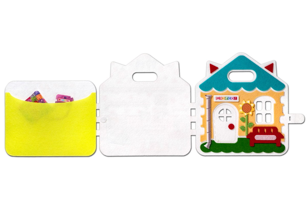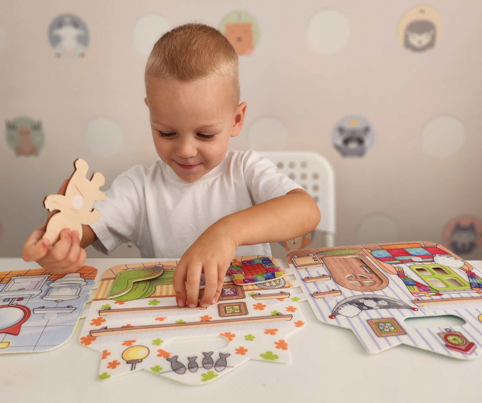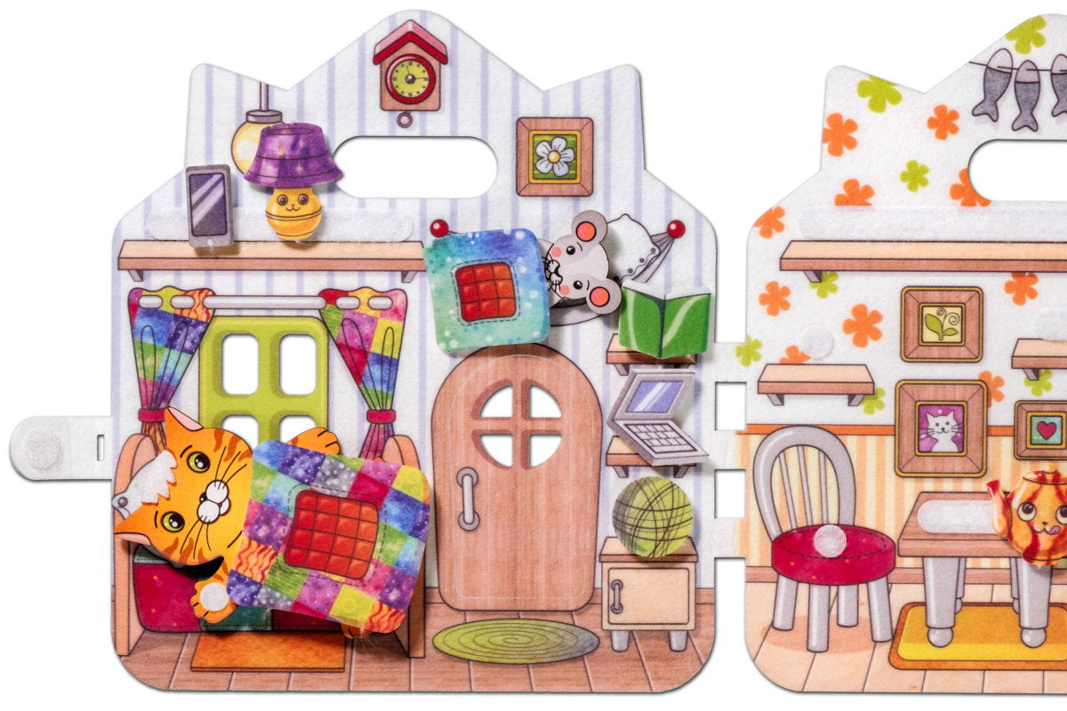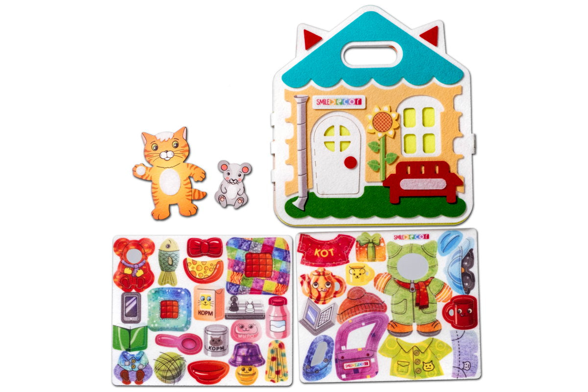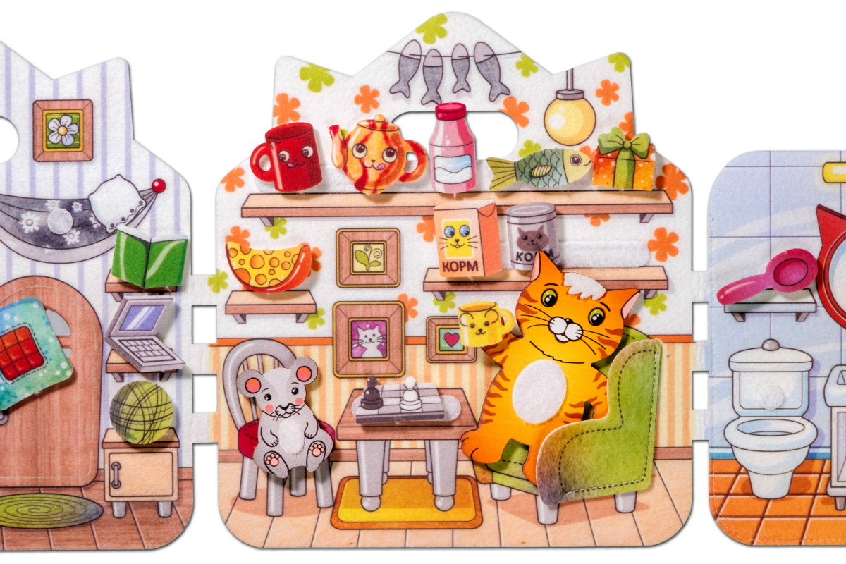 В наборе: 1 фетровая книжка, деревянные кот и мышка, 33 детали из фетра на липучках.